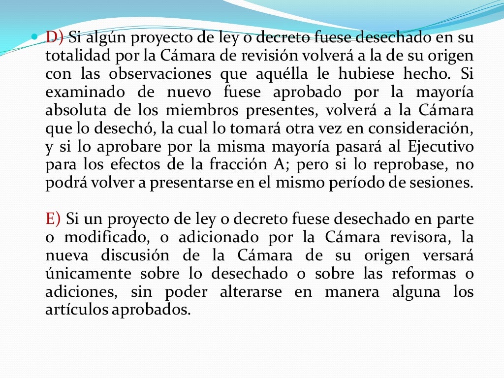 redacción del artículo 72 de la Constitución y la propuesta para su modificación: Comparativo del texto actual del artículo 72 Constitucional y propuesta de reforma . Texto actual Propuesta de reforma Artículo 72. Todo proyecto de ley o decreto, cuya resolución no sea exclusiva de alguna de las Cámaras, se discutirá sucesivamente en ambas,