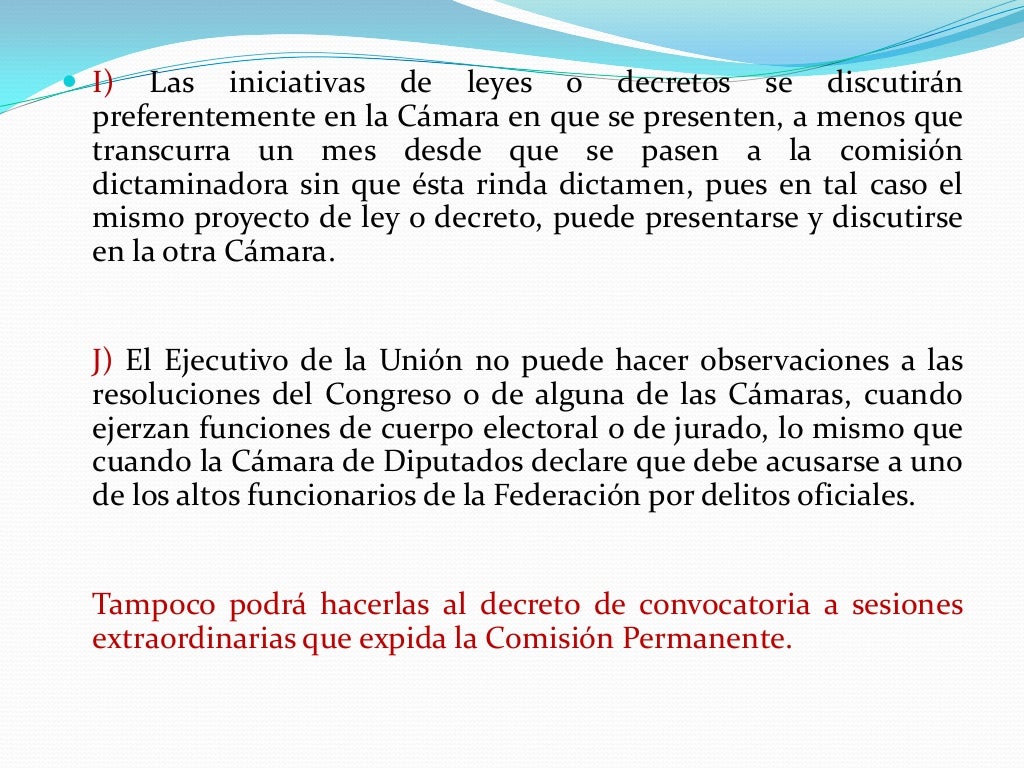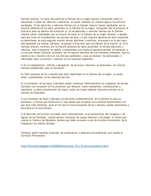Articulo 71 y 72 de la constitucion mexicana. Artículo 71. El derecho de iniciar leyes o decretos compete: I. Al Presidente de la República; II. A los Diputados y Senadores al Congreso de la Unión; y. III. A las Legislaturas de los Estados. Las iniciativas presentadas por el Presidente de la República, por las Legislaturas de los Estados o.