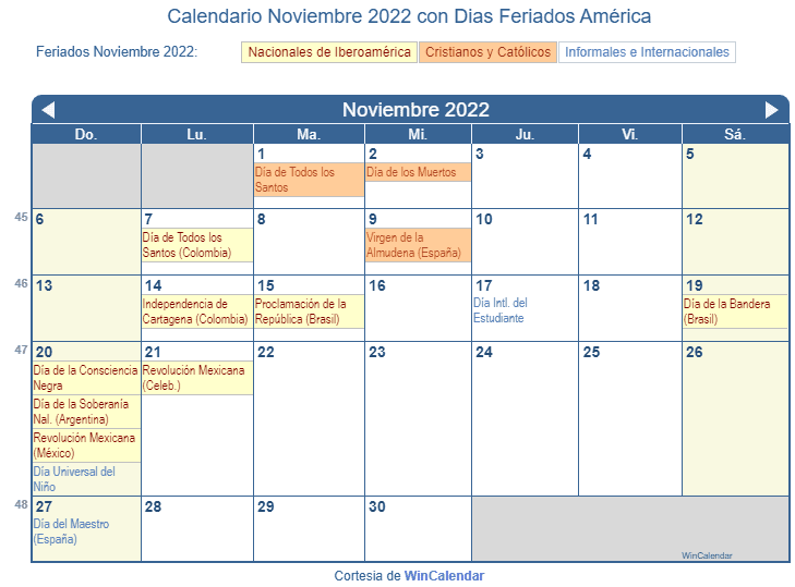 Día de Todos los Santos. 2 noviembre. Día de los Muertos. 20 noviembre. Día de la Revolución Mexicana (día histórico) 21 noviembre. Día de la Revolución Mexicana (día feriado) Este noviembre 2022 calendario siempre es muy útil. Sobre todo cuando deseas consultar las fechas de tus vacaciones.