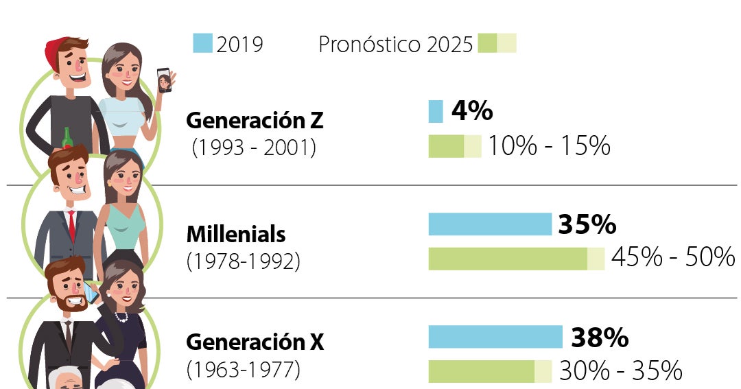 Hoy en día, cada generación tiene una etiqueta definitoria y un conjunto de atributos estereotípicos que se le atribuyen. Están los millennials, generación Z,. 2.667.451 tienen entre 25 y 39 años (que corresponde a la generación millennials), mientras que otras 2.791.144 corresponde a personas entre 40 y 54 años (generación X).