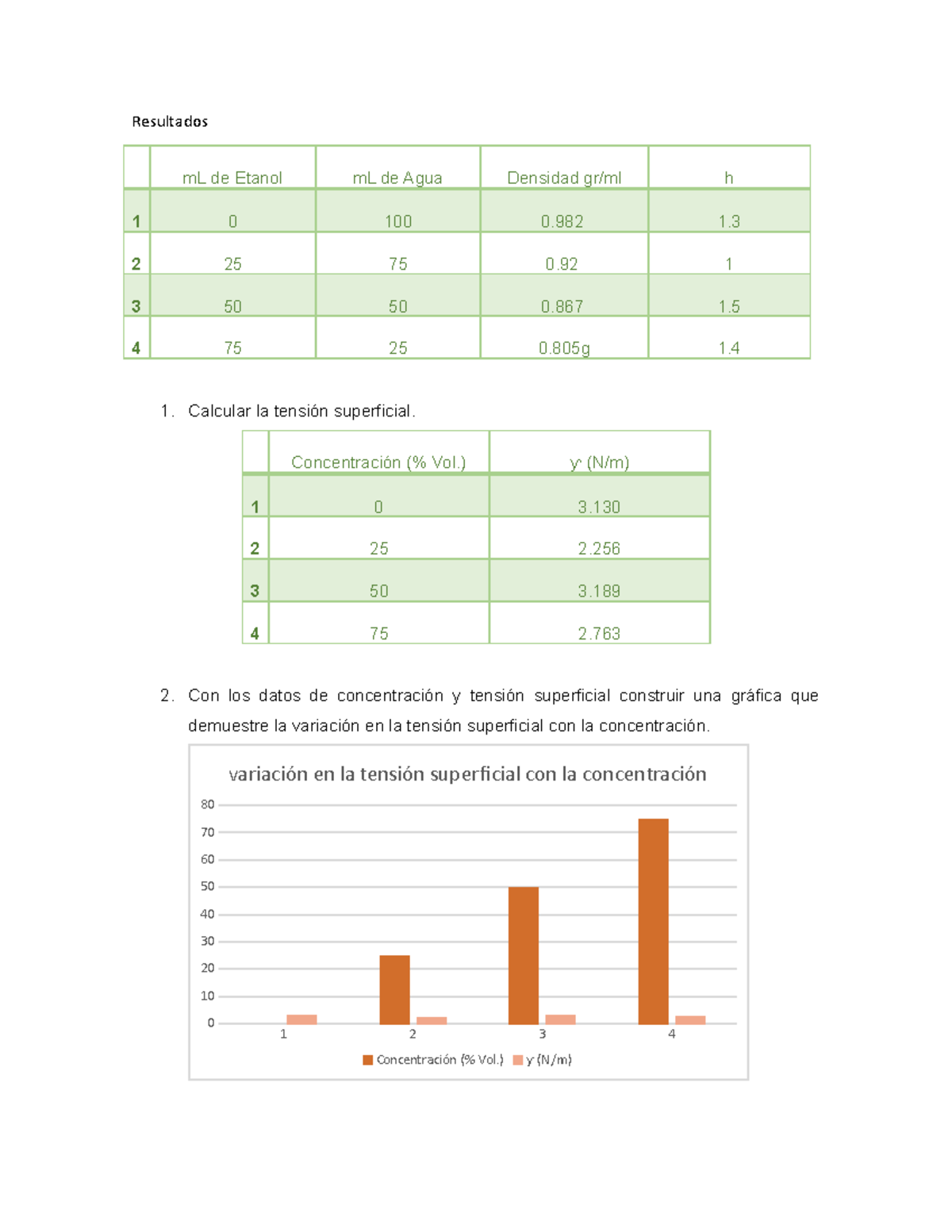 Resultados fisicoquimica Resultados mL de Etanol mL de Agua Densidad gr/ml h 1 0 100 0 1. 2 25