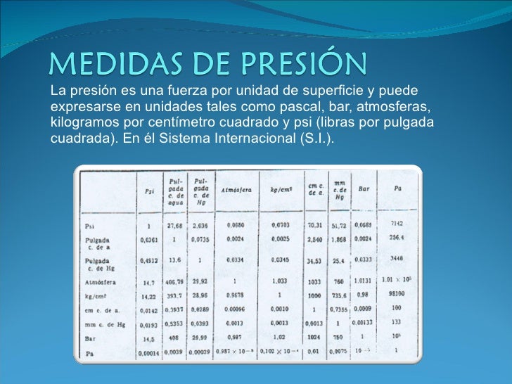 En la mayoría de los cálculos se utilizan las unidades del sistema internacional. Por lo tanto, es importante conocer la equivalencia de las diferentes unidades de presión con relación al pascal. 1pascal = 1N/m 2. 1 atmósfera = 1.013×10 5 pascales (Pa) = 760mmHg. 1 torr = 1mmHg = 133 pascales.