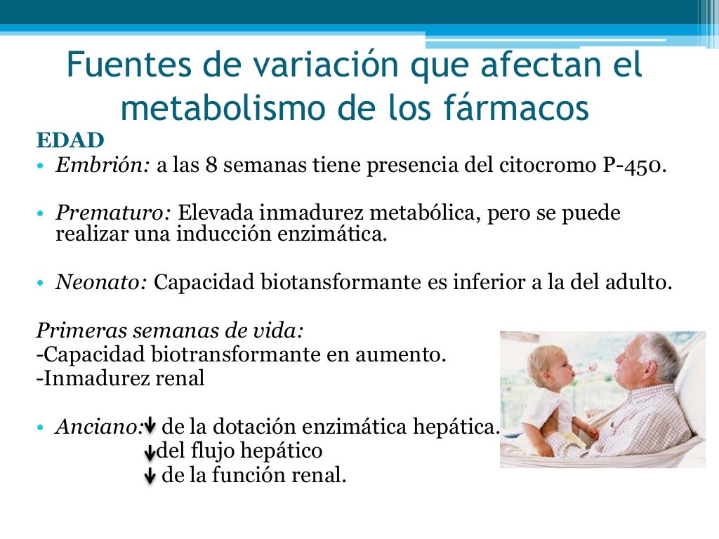 Con el envejecimiento, la capacidad metabólica del hígado a través del citocromo P-450 se reduce en ≥ 30% debido a la disminución del tamaño y del flujo sanguíneo de este órgano. Por ello, en las personas de edad avanzada los fármacos que se metabolizan a través de esta vía alcanzan mayores concentraciones y presentan semividas más largas (véase figura Comparación de los.