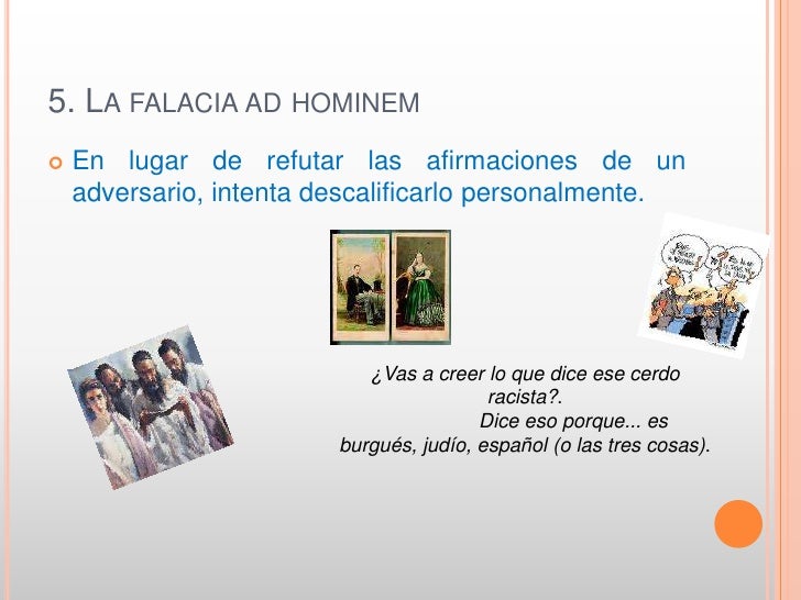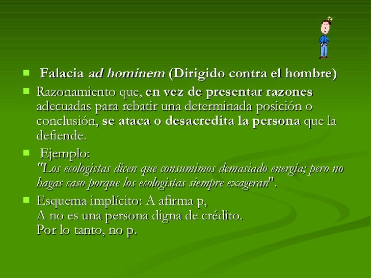 La falacia ad hominem. Su nombre en latín significa "contra el hombre" y quiere decir que, en lugar de combatir las ideas del argumento,. Es una falacia sumamente común en distintos ámbitos de debate, sobre todo en la política, en la que es común desvirtuar públicamente a un individuo para así desvirtuar también sus ideas.