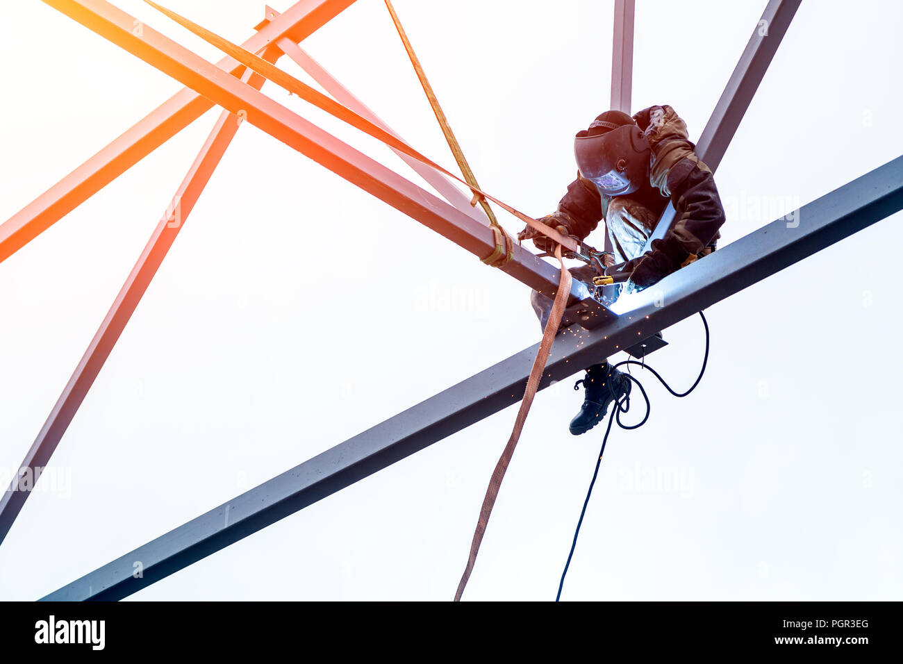 Un hombre soldador trabajar en altura con seguros en máscara de soldadura es de metal de