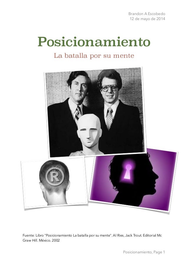 Download Free PDF. View PDF. Posicionamiento: la batalla por su mente (resumen) Jack Trout y Al Ries Cómo ser percibido en un mercado superpoblado 2014 fEste documento es un resumen creado a partir de la lectura del libro "Posicionamiento: la batalla por su mente" de los autores Al Ryes y Jack Trout.