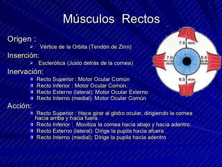 Se insertan en el ojo a nivel de la esclera (recubrimiento exterior blanco del ojo). Estos 6 músculos son: En la parte superior encontramos el recto superior y el oblicuo superior. En la parte lateral interna el recto interno. En la parte lateral externa el recto externo. En la parte inferior el recto inferior y el oblicuo inferior.