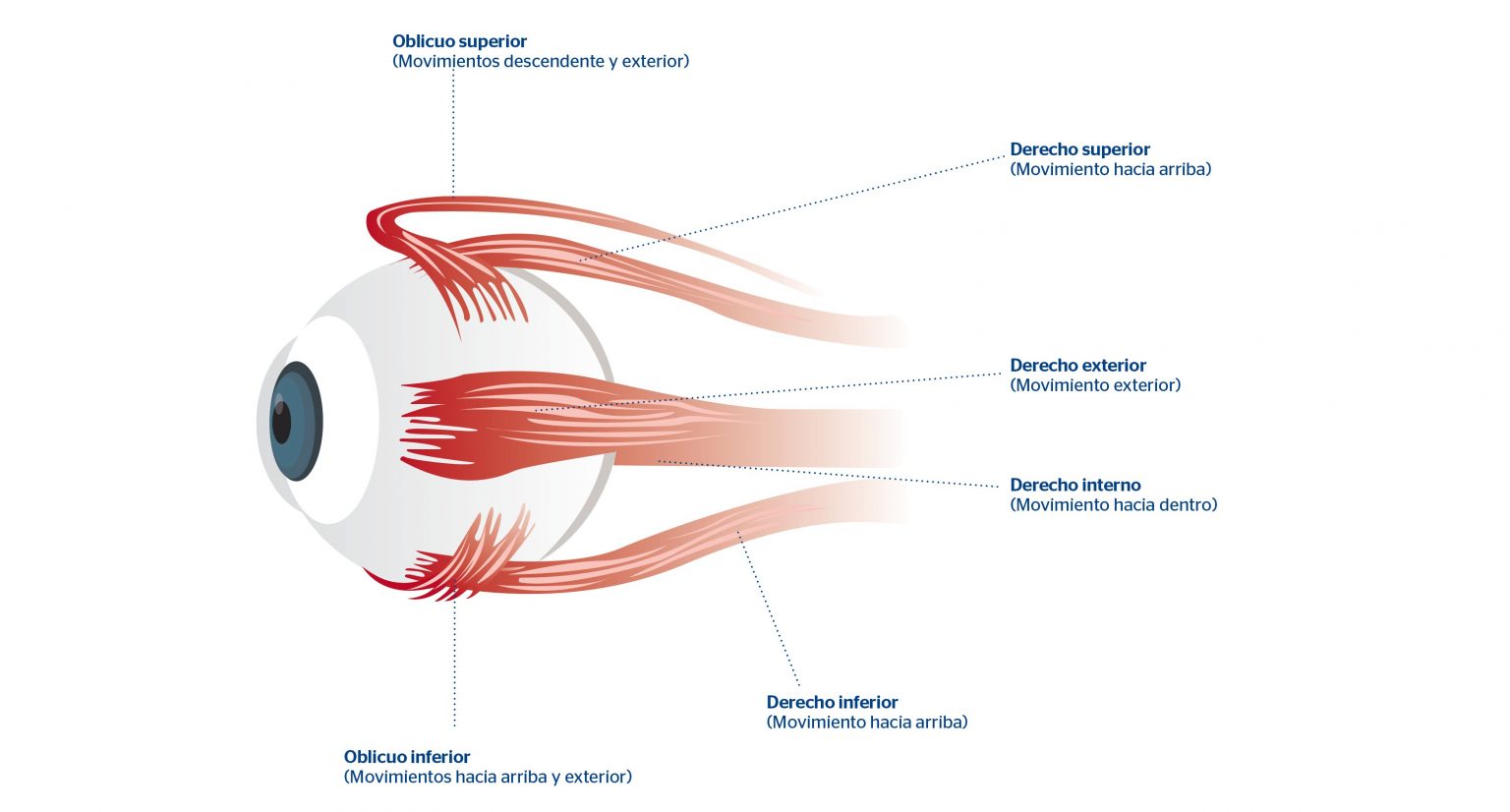 El ojo puede ejecutar diferentes movimientos gracias a la acción de tres pares de músculos conocidos como músculos extraoculares o extrínsecos. El primer par de músculos son los rectos horizontales, luego están los rectos verticales y por últimos los oblicuos. Estos seis músculos son indispensables para el movimiento de los ojos y la.
