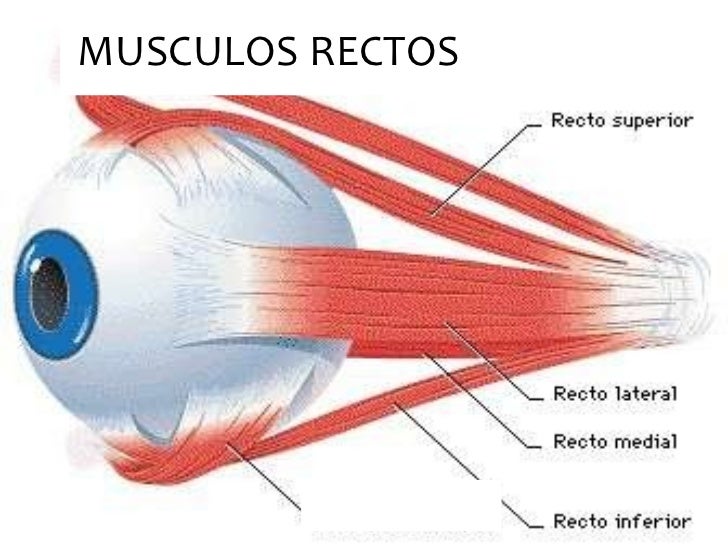 El ojo humano por su parte posee cuatro músculos rectos: El "recto medio". El "recto superior". El "recto lateral". El "recto inferior". El Músculo Recto Medio: de los músculos del ojo es el mayor. Es capaz de mover el globo ocular en dirección abajo, para que de esta manera se pueda observar hacia la nariz.