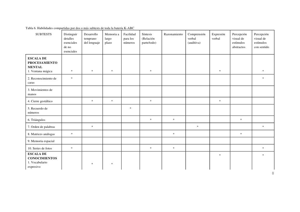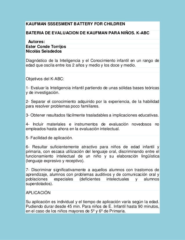 La batería de evaluación para niños de Kaufman y Kaufman (1983): Kaufman. Assessment Battery for Children: K-ABC, es una medida de la habilidad cognitiva y los. conocimientos académicos para.