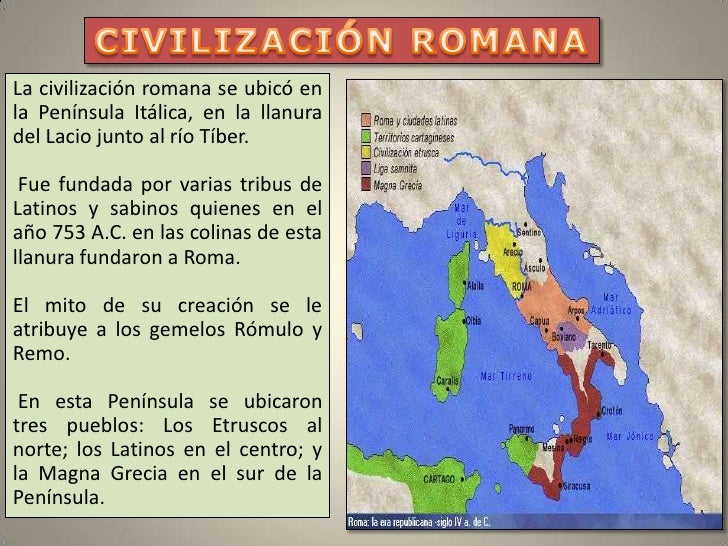 El origen de la civilización romana. Según la leyenda, Roma fue fundada por los gemelos Rómulo y Remo en el año 753 a. C. La civilización romana surgió a lo largo de un proceso que duró cientos de años. En el siglo VIII a. C., la región sobre la que se construyó Roma, en el Lacio, era un lugar favorable al tránsito, pues se ubicaba.