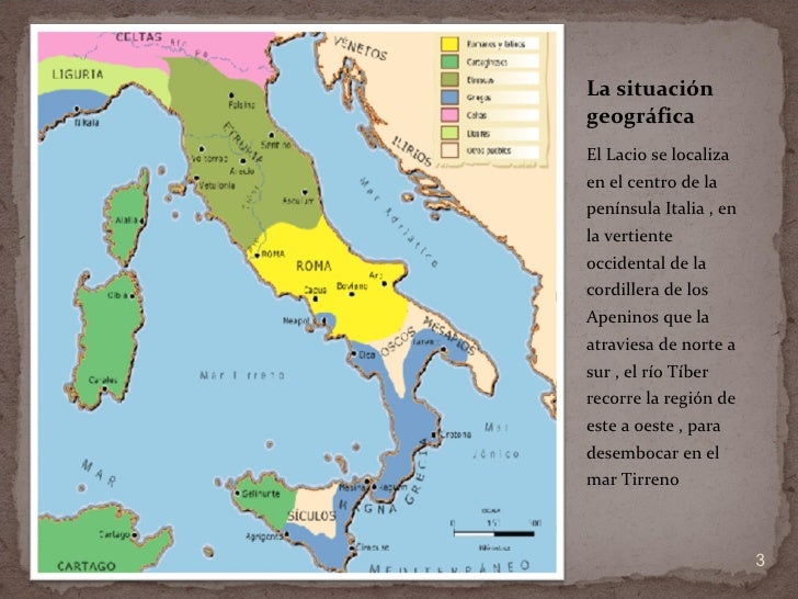 La Cultura Romana, sucesora de la Cultura Griega en la Historia Universal, se desarrollo en la península Itálica.Esta península se encuentra al sur de Europa, penetrando en forma de bota el Mar mediterráneo. Sus límites en la antigüedad fueron: por el norte con los Alpes; por el sur con el Mar Jónico y el Mar mediterráneo; por el este con el Mar Adriático y por el oeste con el Mar.